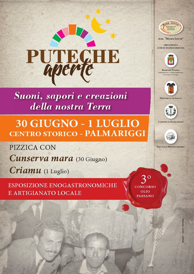 Il 30 giugno e 1 luglio Palmariggi, grazie all’Associazione Mons Jovis Comitato Bruschetta, giunge a questa III edizione di “Puteche Aperte”, che vanta il patrocinio della Regione Puglia, della Provincia di Lecce, del Comune di Palmariggi e dell’associazione Pro-Loco Montevergine Palmariggi. Quest’anno sono due le serate dedicate alla scoperta di piatti a chilometro zero, dei prodotti enogastronomici e dell’artigianato e musica del Salento. Un’occasione per poter visitare il centro storico di Palmariggi recentemente riqualificato e valorizzato tramite l’impegno dell’amministrazione comunale e al sindaco di Palmariggi, Anna Elisa Stifani, neoeletta presidente dell’Unione dei Comuni dell’Entroterra Idruntino – Bagnolo, Cannole, Cursi e Palmariggi. Il rinnovato centro è stato inaugurato il 3 giugno scorso, in occasione della festa Voler Bene all’Italia, l’asfalto logoro e degradato che negli anni sessanta è stato sostituito con basoli di pietra locale come in origine. Il centro storico acquista un nuovo fascino e comincia a rivivere.