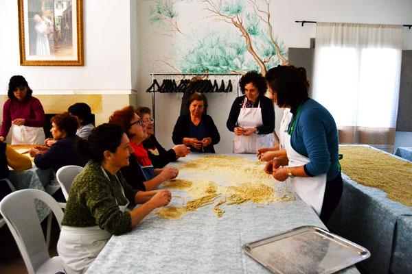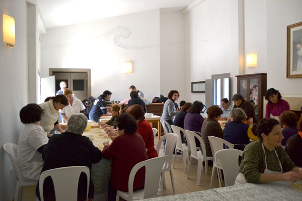 Si respira infatti aria di festa nelle sale della struttura: le signore impastano alacremente, con gesti antichi e sapienti, la farina e l’acqua per far la pasta; nell’aria piena di pollini si diffonde l’odore dolciastro della preparazione; il clima è mite. La storia si ripete assieme ai movimenti delle mani e le memorie riaffiorano, ricordando di quando erano le nonne a farlo, lasciandoci guardare in punta di piedi ai margini di quel tavolo imbiancato di farina, in attesa di assaggiare la pasta cruda.