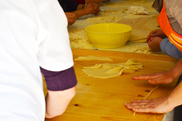 Si respira infatti aria di festa nelle sale della struttura: le signore impastano alacremente, con gesti antichi e sapienti, la farina e l’acqua per far la pasta; nell’aria piena di pollini si diffonde l’odore dolciastro della preparazione; il clima è mite. La storia si ripete assieme ai movimenti delle mani e le memorie riaffiorano, ricordando di quando erano le nonne a farlo, lasciandoci guardare in punta di piedi ai margini di quel tavolo imbiancato di farina, in attesa di assaggiare la pasta cruda.