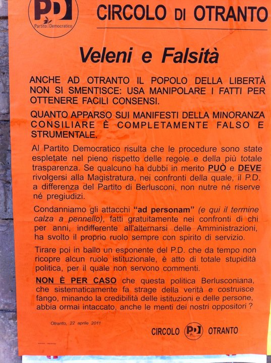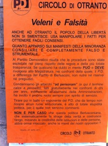 1. […] degli avversari politici, definendo il manifesto affisso dalla minoranza negli scorsi giorni (http://www.otrantooggi.it/2011/04/22/guerra-di-manifesti-sui-bandi-per-i-locali-al-porto-a-otranto-s…) frutto di mere insinuazioni, visto che la sorella dell’assessore al Turismo non ha […]