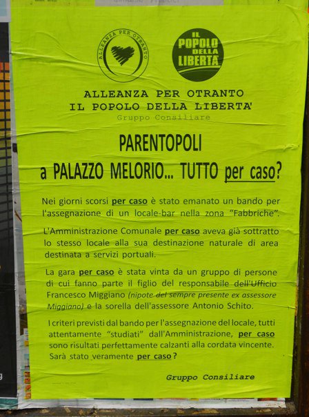 Parenti, cugini, amici: sono innumerevoli i casi del genere che, nel corso degli anni, hanno investito le varie amministrazioni comunali succedutisi alla guida del comune otrantino. E ogni volta la stessa questione: dove finisce la libertà del singolo di partecipare ai bandi pubblici, anche in presenza di parentele eccellenti, e dove comincia quella generale di garantire a tutti pari opportunità di farlo? Nel caso di specie, ovviamente, i presunti vantaggi di chi si è aggiudicato i bandi sono tutte da dimostrare, ma in passato diverse situazioni del genere hanno fatto discutere molto. E poi, ultima notazione sul caso, un fatto è certo: il manifesto del Pdl apre in realtà una lunghissima campagna elettorale che porterà al rinnovo dell’amministrazione comunale il prossimo anno.