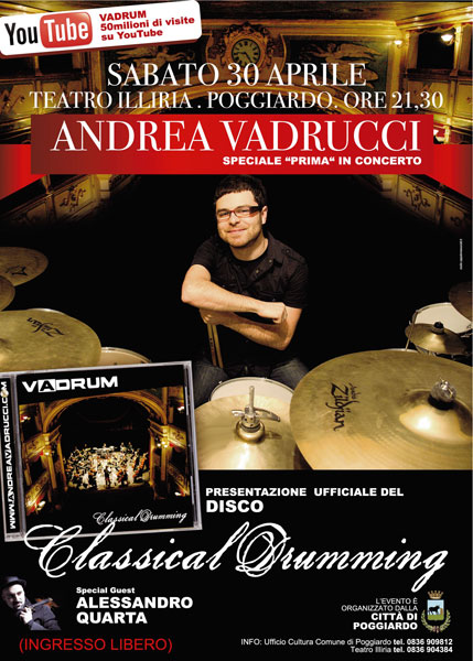 Sarà presentato sabato 30 aprile al Teatro Illiria di Poggiardo in prima mondiale live con un concerto che si preannuncia memorabile l’album “Classical Drumming” di Andrea Vadrucci, alias Vadrum, il talentuoso batterista poggiardese ormai diventato un fenomeno planetario grazie a internet.
