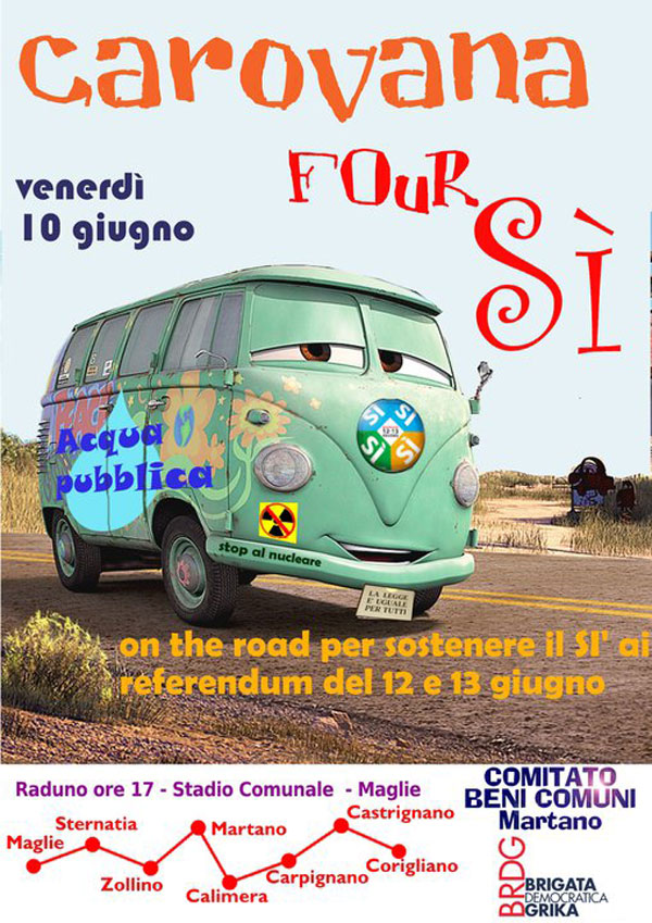 Venerdì 10 giugno, a partire dalle ore 17, i gruppi del Comitato Beni Comuni di Martano e della Brigata Democratica Grika chiuderanno la campagna referendaria con una carovana che partirà dallo stadio comunale di Maglie e arriverà prima in Piazza Aldo Moro, proseguendo poi per molti paesi della Grecìa Salentina: Sternatia, Zollino, Soleto, Martano, Calimera, Carpignano (Serrano), Castrignano de’ Greci e Corigliano d’Otranto.