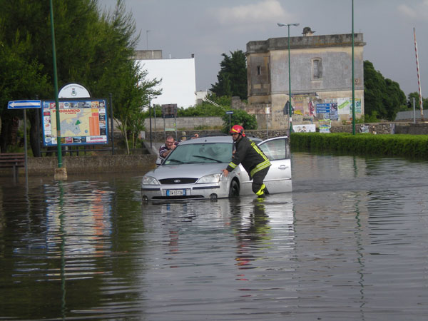 In piazza Episcopo, uno degli scavatori impegnati nei lavori di canalizzazione, si è quasi ribaltato senza però alcuna conseguenza. Ora la situazione è sotto controllo, grazie anche al tempestivo intervento degli operai. Anche il largo stazione è stato interessato da questa ondata improvvisa di maltempo. Solo l’intervento dei vigili del fuoco ha permesso ad un’automobilista di trarre in salvo la propria autovettura impantanata nell’acqua alta e nel fango. Per fortuna nessuna conseguenza anche se il problema degli allagamenti, a Poggiardo, è piuttosto frequente come lamentano alcuni cittadini del posto. I lavori di canalizzazione avviati dal Comune dovrebbero però risolvere del tutto questa annosa questione. Dopo il temporale numerose persone si sono riversate per strada per verificare la situazione. Tranne qualche scantinato allagato e detriti sparsi nei pressi delle abitazioni, non vi è alcun danno sostanzioso. Anche il neo sindaco di Poggiardo, Giuseppe Colafati, è intervenuto sul posto per tranquillizzare i cittadini. Ora a lui, e alla sua giovane giunta, l’arduo compito di risolvere definitivamente un problema, che come ci dicono alcuni cittadini, va avanti da almeno venti anni.