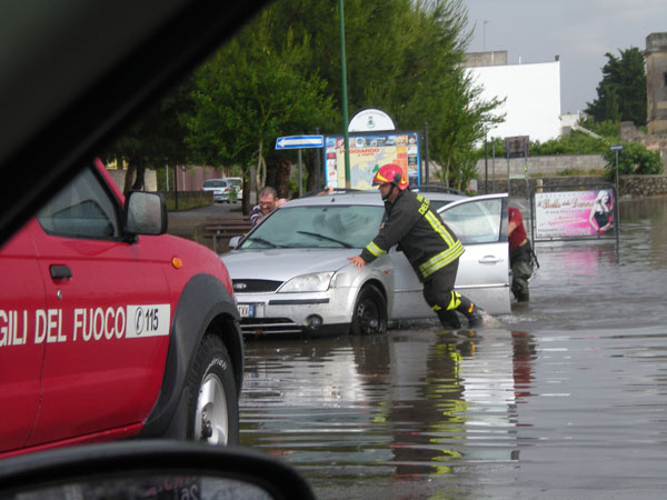 In piazza Episcopo, uno degli scavatori impegnati nei lavori di canalizzazione, si è quasi ribaltato senza però alcuna conseguenza. Ora la situazione è sotto controllo, grazie anche al tempestivo intervento degli operai. Anche il largo stazione è stato interessato da questa ondata improvvisa di maltempo. Solo l’intervento dei vigili del fuoco ha permesso ad un’automobilista di trarre in salvo la propria autovettura impantanata nell’acqua alta e nel fango. Per fortuna nessuna conseguenza anche se il problema degli allagamenti, a Poggiardo, è piuttosto frequente come lamentano alcuni cittadini del posto. I lavori di canalizzazione avviati dal Comune dovrebbero però risolvere del tutto questa annosa questione. Dopo il temporale numerose persone si sono riversate per strada per verificare la situazione. Tranne qualche scantinato allagato e detriti sparsi nei pressi delle abitazioni, non vi è alcun danno sostanzioso. Anche il neo sindaco di Poggiardo, Giuseppe Colafati, è intervenuto sul posto per tranquillizzare i cittadini. Ora a lui, e alla sua giovane giunta, l’arduo compito di risolvere definitivamente un problema, che come ci dicono alcuni cittadini, va avanti da almeno venti anni.