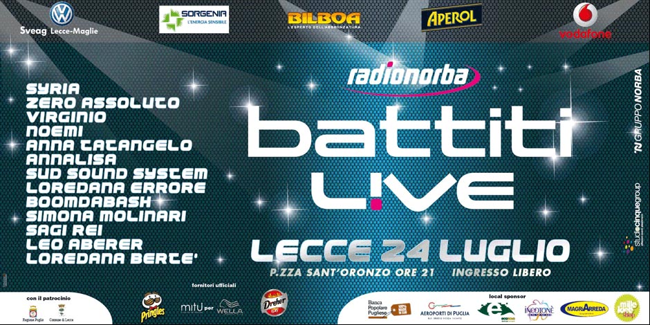Il Radionorba Battiti Live 2011 approda nel Salento: domenica 24 luglio, alle 21, lo spettacolo musicale itinerante sarà di scena a Lecce, in piazza Sant’Oronzo. Un classico per il Battiti Live, sempre presente nel capoluogo salentino. A fare gli onori di casa i Sud Sound System, che sul palco di Battiti riceveranno un riconoscimento da Radionorba per i vent’anni di carriera. Salentini sono anche i Boomdabash, giovane band nota nell’ambiente hip hop pugliese, originaria di Tricase, cui la radio del Sud ha voluto offrire l’occasione di esibirsi sul palcoscenico di Battiti. Non mancheranno i cantanti sfornati dai talent show: il vincitore di “Amici” di quest’anno, Virginio Simonelli, e la seconda classificata Annalisa Scarrone, ma anche la seconda della penultima edizione del talent di Maria De Filippi, Loredana Errore. Anche Noemi presente a Lecce, la rossa della seconda edizione di X-Factor. Arriva da Sanremo Giovani invece Simona Molinari, anche lei nel cast della seconda tappa di Battiti. Tra i big Loredana Bertè, Anna Tatangelo, Syria, gli Zero Assoluto e due ospiti internazionali, Leo Aberer e l’italoisraeliano Sagi Rei. Oltre tre ore di musica e spettacolo con la novità di quest’anno: l’animazione preserale con la musica più bella dell’estate e simpatici gadget dei partner commerciali di Radionorba per i tanti spettatori che si recheranno al palco sin dal pomeriggio.