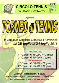 Eliminatorie in corso al Circolo tennis “Mario Stasi” di Otranto per la categoria Non Classificati. I primi quattro raggiungeranno l’altra categoria, quella dei Classificati, alla fase finale del torneo nazionale di tennis di 4a Categoria singolare maschile e femminile che si terrà dal 25 al 31 luglio. In quella settimana, i partecipanti, 70 per la categoria maschile e 20 per quella femminile, a partire dalle 16 si daranno battaglia nei due campi in cemento per aggiudicarsi il montepremi finale. Il primo e secondo classificato, sia maschile che femminile, riceveranno la coppa e un premio in denaro. Nello specifico, alla categoria maschile andranno 150 euro e 75euro. Invece alle vincitrici toccheranno rispettivamente 50 euro e 25 euro. Quest’iniziativa, considerato il buon numero di partecipanti provenienti da ogni parte d’Italia, ha soddisfatto gli organizzatori del circolo tennistico idruntino. Anche Andrea Conte, uno dei frequentatori più assidui dei campi tennistici otrantini, esprime il suo entusiasmo per l’iniziativa agonistica in corso: “Auspico che ciò possa contribuire a far crescere la considerazione per il tennis nella nostra città”.