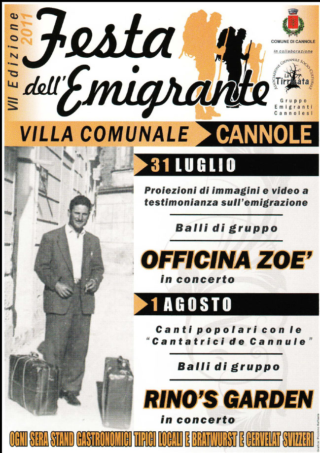Il 31 luglio e l’1 agosto, presso piazzale Europa a Cannole, si terrà la Festa dell’Emigrante, dedicata a tutti coloro che sono emigrati all’estero, specialmente in Svizzera, a partire dagli anni ’50. Verranno proiettati in prima serata filmati con testimonianze di cannolesi e durante le due serate si potranno degustare prodotti tipici locali e specialità elvetiche come i bratwurst e cervelat. La festa, organizzata dall’amministrazione comunale, prevede la collaborazione con l’Associazione Cannolesi in Svizzera e l’associazione giovanile socio-culturale “La Tirricata”, nata per rinsaldare i rapporti tra la popolazione locale e i suoi migranti e per far conoscere il fenomeno dell’emigrazione salentina. Dai porti e dalle stazioni del Mezzogiorno partirono navi e littorine, con migliaia di italiani diretti in America e in Nord Europa per trovare fortuna: in totale furono quasi tre milioni le persone emigrate da Calabria, Campania, Puglia e Sicilia. A partire dagli anni ‘50 l’emigrazione aveva come destinazione soprattutto Stati europei in crescita come Francia, Svizzera, Belgio e Germania ed era considerata da molti, al momento della partenza, come emigrazione temporanea, spesso solo di alcuni mesi, per lavorare, guadagnare e costruire poi un migliore futuro in patria. Tuttavia molti degli emigranti rimasero poi nei Paesi d’arrivo dando vita alle comunità italiane all’estero.