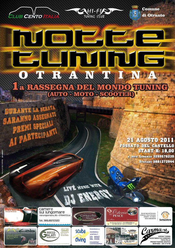 Su un motore al castello. Si è tenuta ieri sera a Otranto la prima edizione de “La Notte Tuning Otrantina”, prima rassegna del mondo tuning (auto, moto e scooter). La notte si è riempita di luci suoni e colori grazie alle auto dei soci dell’Hi Fi Tuning Club di Martano e di tutti gli appassionati tuners del Salento. Nel suggestivo fossato del castello di Otranto, in un mix di auto elaborate, scooter da competizione e impianti hi fi da migliaia di watt, l’Hi Fi Tuning Club di Martano ha messo in mostra le innovazioni e l’estetica di un settore che interessa a oggi molti addetti nel Salento e che conta migliaia di appassionati. Un settore tra i pochi in crescita, che grazie a iniziative di questo tipo trova nuovi mercati e clientela. “La serata è stata tra le più riuscite degli ultimi tempi – hanno raccontato gli organizzatori – Unica nota stonata, che registriamo e riportiamo dai nostri visitatori, il prezzo spropositato delle bevande nei bar. Così il turismo si allontana da Otranto”.