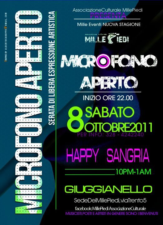 L’associazione culturale di Giuggianello Mille Piedi il 6 ottobre ha compiuto due anni. Per festeggiare il “compleanno” la sera di sabato 8 ottobre ritorna la manifestazione Microfono Aperto, un evento creato per dar voce alla cultura e all’arte di ogni genere, dedicato a chiunque abbia voglia di prenderne parte attivamente o anche solo come spettatore. La musica, la letteratura, la pittura e qualsiasi tipo di espressione culturale diventano le protagoniste del sabato sera, un modo piacevole e differente per passare una serata arricchendosi con divertimento. Il microfono è aperto a tutti coloro che hanno dentro di loro una vena artistica, un’occasione per chi non ha abitualmente la possibilità si esprimersi con la propria arte. Durante la serata si possono esporre i propri dipinti, cantare le proprie canzoni o leggere delle poesie. L’associazione è nata due anni fa dall’iniziativa di un gruppo di giovani che amano profondamente la cultura, considerandola come un elemento prezioso della nostra società, che va nutrito e coltivato con varie iniziative in cui poter coinvolgere il maggior numero possibile di persone. Il luogo in cui si svolge la manifestazione è molto intimo, dall’aspetto “popolare” e caldo, uno spazio non troppo grande per fare in modo che non ci sia dispersione ma un maggior raccoglimento. Cultura, arte e musica accompagnate da un bicchiere di sangria sono gli ingredienti di questa speciale serata. L’inizio è previsto per le ore 22.