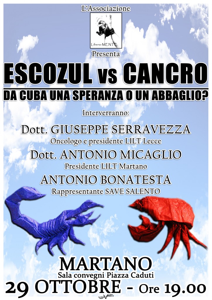 Il vidatox è una speranza per i malati di cancro o un semplice placebo? Se ne parla sabato 29 ottobre alle ore 19 a Martano, presso la sala convegni di piazza Caduti, con un convegno dal titolo “Escozul vs Cancro. Da Cuba una speranza o un abbaglio?”, che tratta del nuovo medicinale in via di sperimentazione in Albania come cura contro il cancro, almeno al primo stadio della malattia. Promosso dall’associazione Libera-Mente, all’incontro parteciperanno Giuseppe Serravezza, oncologo e presidente provinciale della Lilt, Antonio Micaglio, presidente della Lilt di Martano e Antonio Bonatesta, rappresentante di Save Salento. La storia di Escozul, il siero da cui si produce il vidatox, inizia quando dei medici cubani si sono accorti che i contadini punti dallo scorpione in questione sono guariti da malattie quali l’artrite reumatoide e hanno così scoperto che il veleno di questo animale ha delle proteine che fungono da antinfiammatorio. Facendo delle ricerche più mirate, hanno visto che oltre a togliere le infiammazioni aveva un effetto analgesico, un effetto immunoregolatore e soprattutto antitumorale. La specie che produce la tossina da cui si ricava l’Escozul è il rophalurus iunceus che vive soltanto nell’isola di Cuba. In ogni caso, il siero rappresenta un interrogativo, per questa ragione il farmaco si sta sperimentando in un paese del Terzo Mondo come l’Albania, dove la ricerca presenta meno regole che ad esempio in Italia.