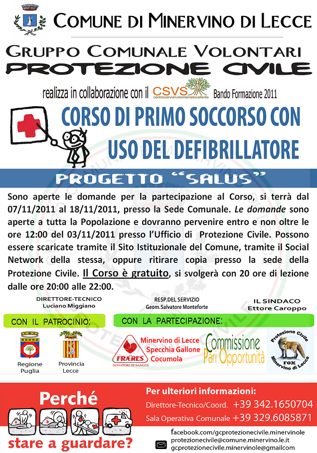 A Minervino lo scorso 7 novembre ha preso avvio Salus, il corso di primo soccorso e uso del defibrillatore portatile. Ѐ stato organizzato dal gruppo comunale di protezione civile in collaborazione con la commissione per le Pari Opportunità e finanziato dal Centro Servizi Volontariato Salento. A questa iniziativa hanno partecipato, inoltre, l’associazione di Protezione Civile Fox e i gruppi Fratres delle località di Minervino, Cocumola e Specchia Gallone.
