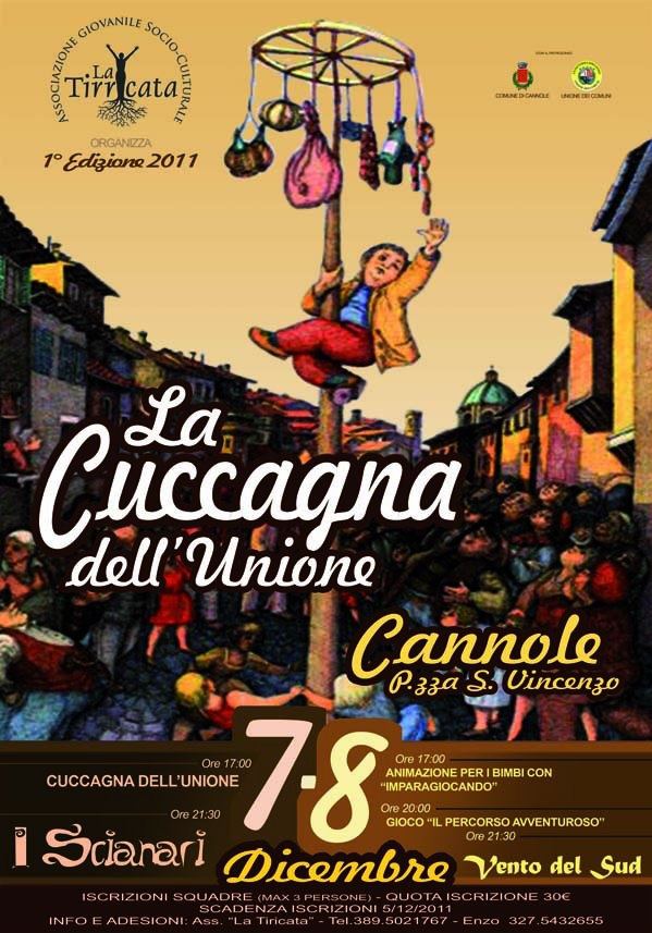 A Cannole arriva la cuccagna. È quella organizzata dall’associazione giovanile socio-culturale “La Tirricata”, un circolo nato in questi mesi, e organizzata per il 7 e l’8 dicembre dalle 17 in piazza san Vincenzo Ferreri a Cannole. All’evento si è voluto dare il nome de “La Cuccagna dell’Unione”. Naturalmente ci sarà un albero della cuccagna, ossia un gioco a squadre molto in voga nei tempi antichi, che era costruito con un palo interamente cosparso di ghiaccio, sulla cui cima vengono appesi generi alimentari di ogni tipo. Il palo, essendo cosparso di grasso, rende difficoltosa la salita, per cui il gioco di squadra risulta fondamentale. Il gioco è divertente non solo per chi cerca di salire, ma anche per chi guarda, che tra risate e incitamenti assiste a uno spettacolo unico nel suo genere. Ci saranno comunque altri divertimenti nel corso dell’evento, come concerti di musica popolare (degli Scianari il 7 dicembre e dei Vento del Sud l’8 dicembre), spazi riservati ai più piccoli con allestimento di gonfiabili, animazione e percorsi a ostacoli, stand di gastronomia tipica e tanto vino.