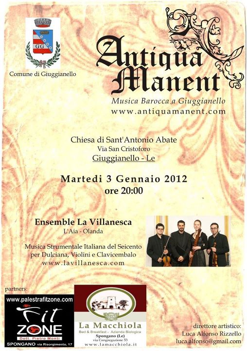 L’ensemble La Villanesca è nato nel 2010 a L’Aia, in Olanda, dall’incontro di quattro musicisti di varia provenienza accomunati dalla passione per la musica del XVII secolo. Tutti i componenti hanno studiato Prassi Esecutiva della Musica Antica su Strumenti Originali nelle migliori scuole specializzate d’Europa e si esibiscono regolarmente con orchestre ed ensembles di Musica Barocca in Europa e in tutto il mondo.
