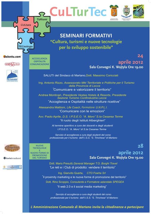 Incontri dal taglio pratico, utile per gli operatori turistici e anche per i cittadini e gli amministratori, quelli dell’ambito dei seminari Culturtec organizzati dal Comune di Martano, con l’assessorato alla Cultura e Turismo, in congiunzione con l’associazione Apice.