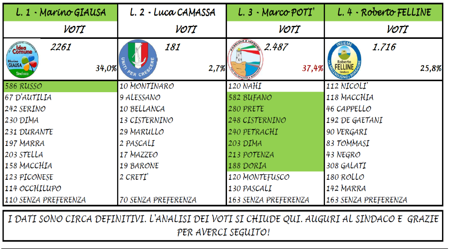 I numeri hanno dato ragione a Marco Marcello Niceta Potì, eletto per i contenuti della sua campagna elettorale e certamente ha influito anche il ricordo dello zio. Con 2363 voti Marco è stato accolto come nuovo sindaco tra abbracci e fuochi d’artificio. La maggioranza consiliare sarà composta da Bufano eletto con 582 preferenze, Prete 262, Cisternino 233, Petrachi 227, Dima 201, Potenza 195, Doria 180. I consiglieri d’opposizione eletti sono Marino Giausa 2148 voti, Mauro Russo 582 entrambi lista 1 e Luigi Roberto Felline della lista 3. Rimangono fuori dall’assegnazione dei seggi la lista numero 2, guidata da Genis Luca Camassa, Uniti per crescere.