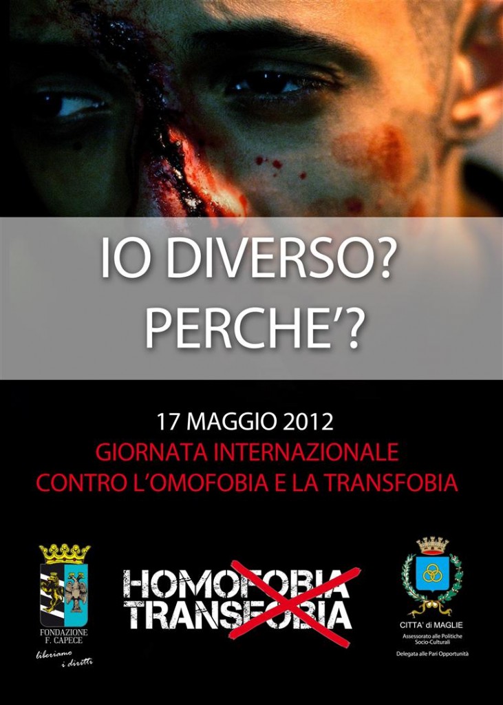 “Io diverso? Perché?”: il messaggio shock contro l’omofobia e la transfobia arriva dalla Fondazione “Francesca Capece” che di concerto con l’assessore alle politiche socio-culturali del Comune di Maglie, Rossano Rizzo e con la delegata alle pari opportunità, Valeria Leone ha deciso promuovere una campagna proprio in occasione della Giornata internazionale contro l’omofobia e la transfobia celebrata dall’Unione europea ogni 17 maggio sin dal 2007. I cittadini magliesi, a partire dai prossimi giorni, saranno invitati a riflettere sulle immagini che troveranno posto su installazioni pubblicitarie, cartelloni 6 x 3 e giornali locali: sarà un volto tumefatto a chiedere il perché di una violenza cieca e senza ragione, con uno sguardo che non ammette scuse e che sembra inchiodare, attraverso gli occhi, chi discrimina gli altri in base a preconcetti incivili e indegni di un paese moderno.