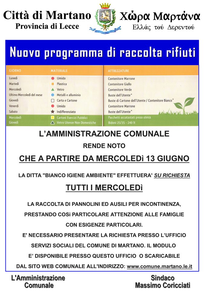 Ha preso il via oggi a Martano la raccolta dei pannoloni per incontinenza, al via anche la nuova campagna di raccolta rifiuti. L’altro ieri si è tenuto anche il consiglio comunale martanese, in cui la minoranza ha presentato alcune interrogazioni, e una risposta orale sulla questione rifiuti.