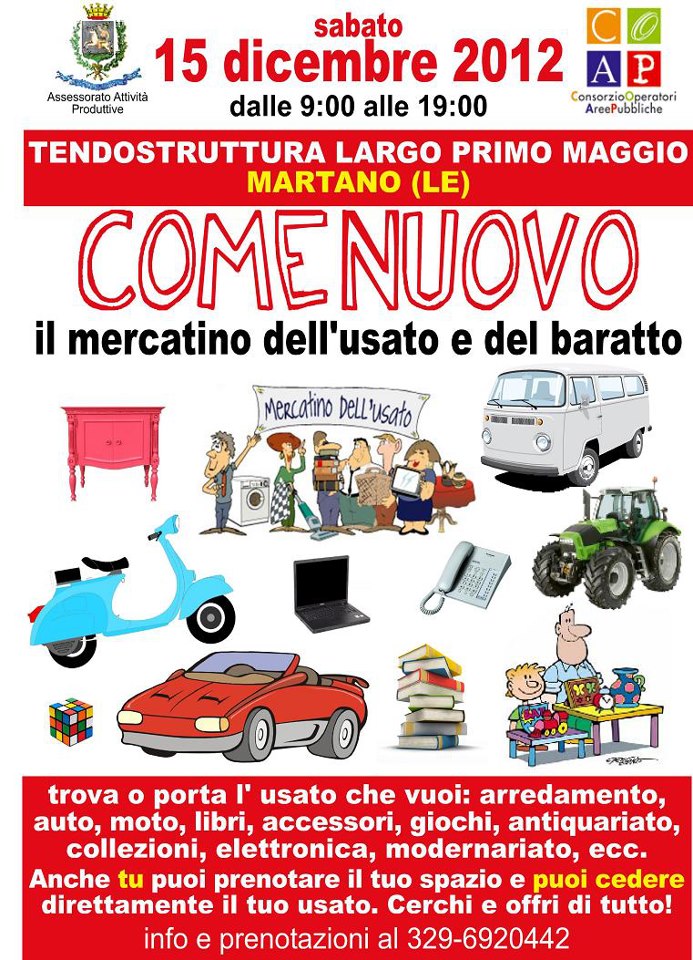 Prende il via anche il primo mercato dell’usato a Martano, si svolgerà in una sola giornata, il 15 dicembre presso largo Primo maggio dalle 9 alle 19. Il mercatino è organizzato dal comune di Martano-Assessorato per le attività produttive e dal COAP- Consorzio Operatori Aree Pubbliche. Quest’iniziativa permetterà a chiunque di dare nuova destinazione a oggetti usati o in disuso, prenotando il proprio spazio presso la tensostruttura. Tutto potrà essere barattato o venduto e in tempi di ristrettezze economiche e necessità ecologiche, l’evento potrebbe dare un po’ di respiro ai fruitori ponendosi in pieno accordo con le tendenze di recupero e riciclaggio.
