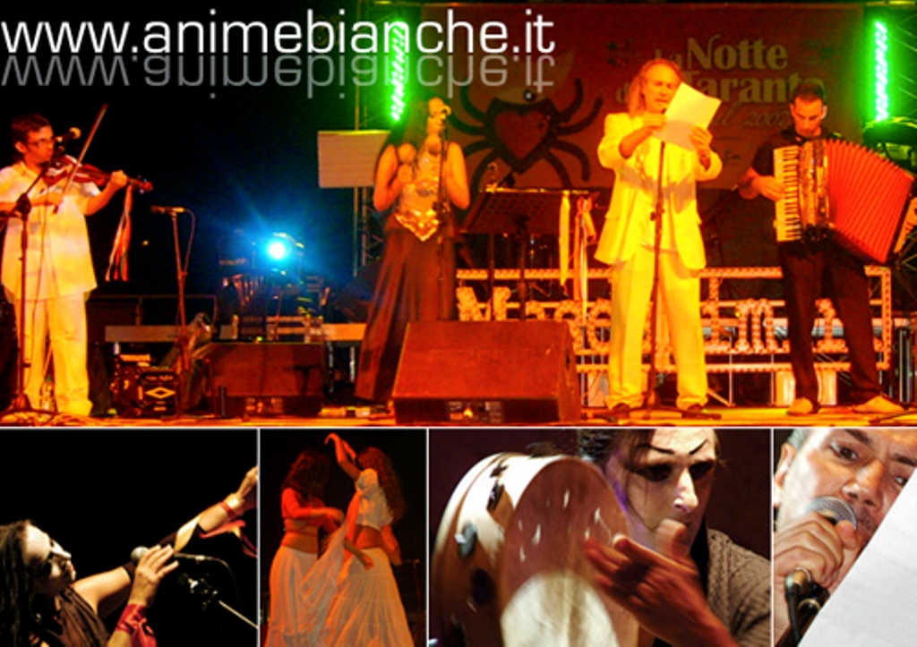 Le Anime Bianche sono una realtà ormai consolidata, hanno vinto una grande scommessa, coniugando magistralmente una tradizione popolare con una poesia attuale e coinvolgente. Gli strumenti utilizzati dal gruppo sono un grande coinvolgimento ritmico ed emotivo, una spiccata teatralità, una intensa interpretazione. Musica di tradizione ma non solo; testi di tradizione ma non solo. Stella Grande la cantante e maggiore interprete del repertorio del gruppo, oltre che una voce duttile e potente, possiede un magnetismo eccezionale, dal 2004 voce della Orchestra de La Notte della Taranta, sotto le direzioni di Ambrogio Sparagna e Mauro Pagani. Elio Coriano, fondatore del gruppo, uno dei poeti più affermati in campo nazionale e inoltre un attento animatore culturale. La testimonianza migliore della maturità del gruppo è fornita dal numeroso pubblico che segue i suoi concerti in tutta Italia e all’estero. Lo spettacolo è frutto di una sapiente alchimia tra tradizione popolare salentina e ritmi più contemporanei, tra testi che possono essere considerati ormai dei classici e canzoni che trattano problematiche attuali.