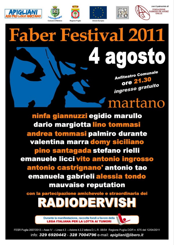 Posted on 01 Agosto 2011. Tags: Faber festival, Fabrizio De Andrè, Martano, Pro Loco Apigliani