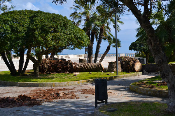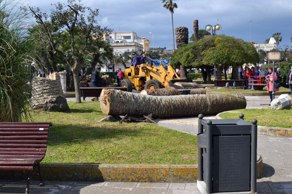 Problema vecchio. Oggi la ditta incaricata dall’Amministrazione ha iniziato il taglio dei palmizi marcescenti della villa comunale Hidrusa. Non molto tempo fa, era toccato allo storico fusto in piazza D’Aragona, ora al suo posto c’è un leccio.